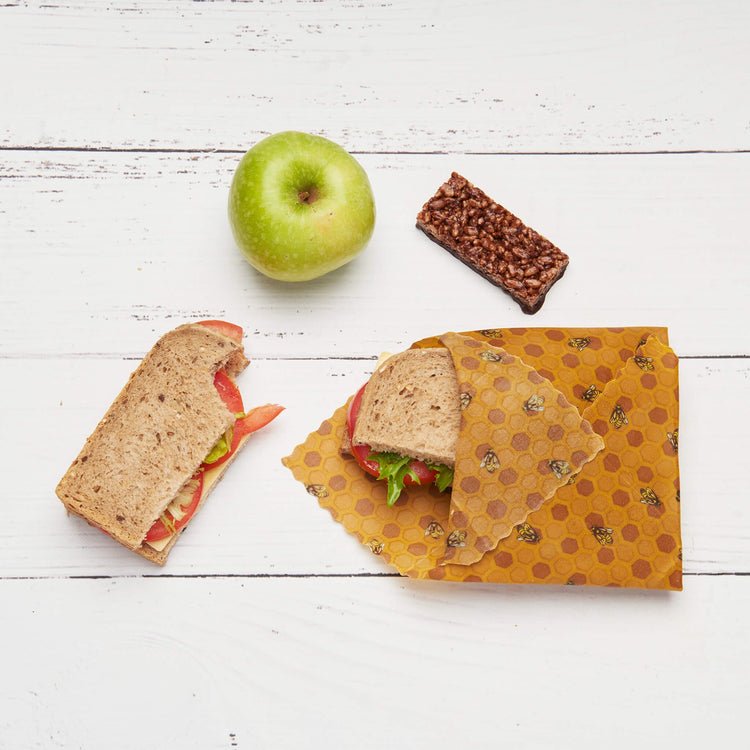 One large Apiwraps beeswax wrap ready to wrap your sandwiches again and again for over a year. Give it a quick rinse and wash and let it dry on the rack for tomorrow’s lunch. Your large Apiwraps can also be used for so many other jobs too – covering salad bowls, keeping herbs in the fridge and big blocks of cheese too!