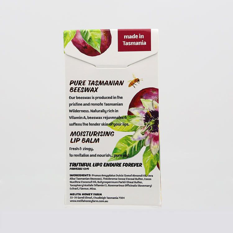 This lip balm takes us back to warm summer days sitting under a heavily laden vine of passionfruit! Tangy and refreshing for extra zing!
