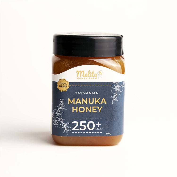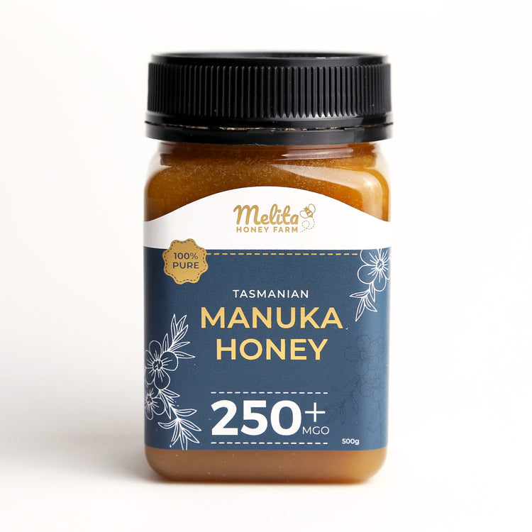 Manuka honey’s antibacterial properties are what set it apart from traditional honey. Methylglyoxal (MGO) is its active ingredient and thought to be responsible for these antibacterial effects. MGO comes from the conversion of another compound in Manuka honey known as dihydroxyacetone (DHA), a high concentration of which is found in the nectar of Manuka flowers. Melita Manuka Honey comes in 3 ratings: 100+ MGO, 250+ MGO & 400+ MGO.